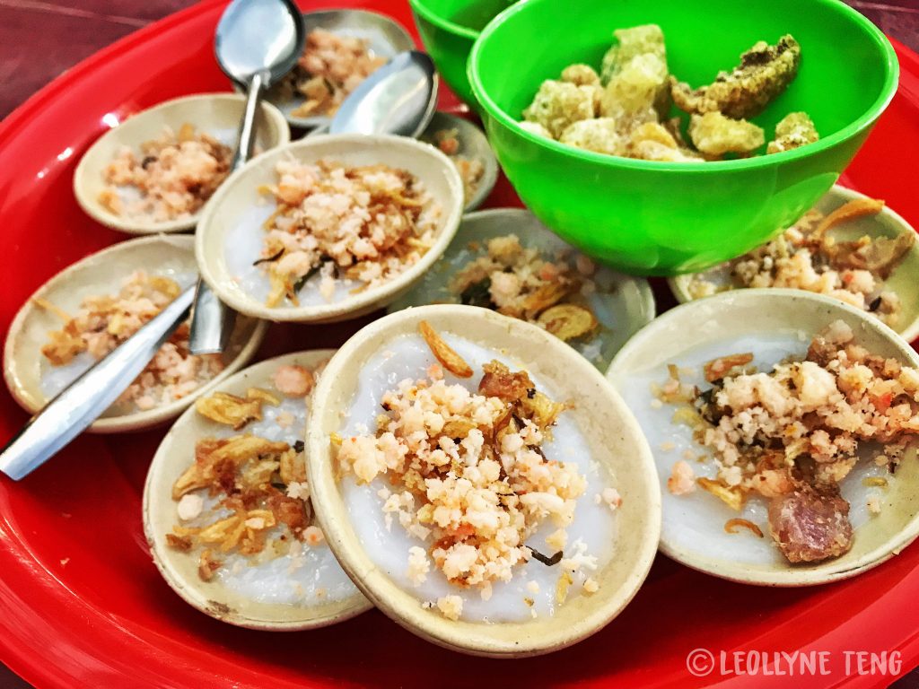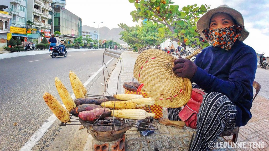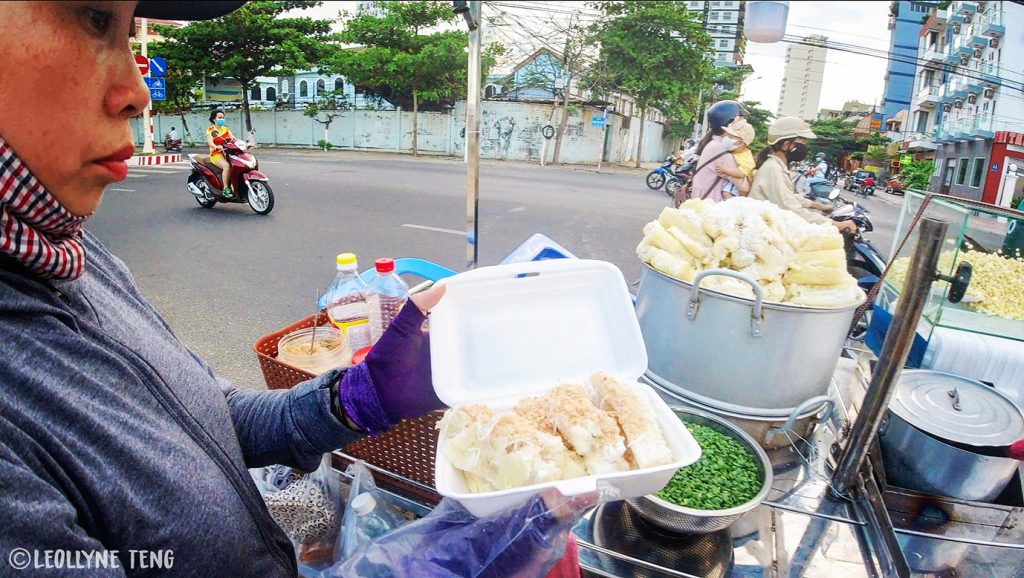 BBQ meat street vendors offer a wide variety of meats and meat balls grilled and flavored. A lady selling roasted corn and sweet potatoes on the streets of Nha Trang. Usually they carry a container with shallots and other spices that they will put over your corn or potato upon request. Food street vendors in Hue, VietnamA street vendor in the city of Nha Trang selling boiled tapioca sprinkled with sugar and grated coconut. White Rose Dumplings (Bánh bao, bánh vạc) are made from two small 2-inch diameter rounds of rice paper with a small spoonful of meat or shrimp filling in the center. When the rice paper is steamed, the edges get soft and chewy and warp a little, making the dumpling look like a white flower.
