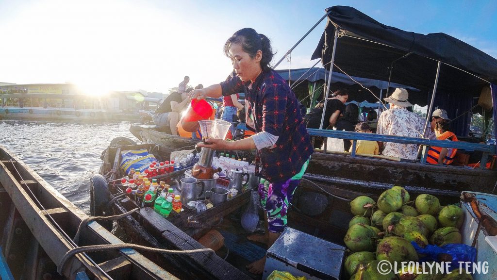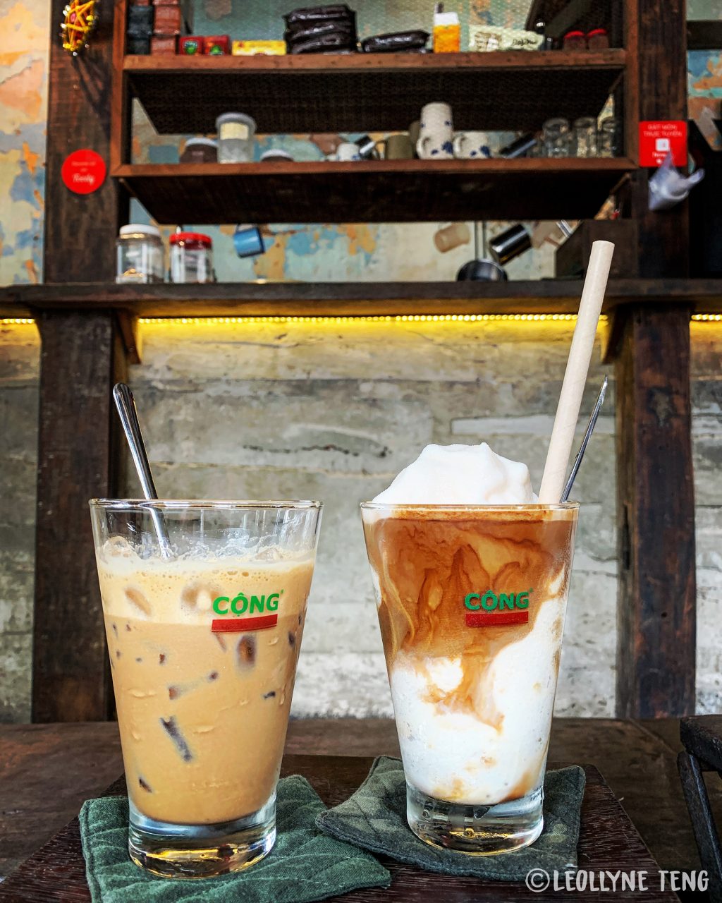 Cà phê dừa (coconut milk coffee) at Cộng Cà Phê Cà phê dừa or Vietnamese Coconut Coffee is one of the unique coffees we fell in love with in Vietnam. Often served as a smoothie, it includes Vietnamese coffee, condensed milk, and coconut milk blended to absolute perfection which must be enjoyed to the last drop. https://congcaphe.comCoffee, cold drinks and fresh coconut water vendor on her floating shop at Mekong River serving us iced black coffee (cà phê đen đá)Cà Phê Trứng (Egg Coffee) Vietnamese egg coffee (cà phê trứng), a unique kind of coffee that you cannot miss, consists of coffee with sugar, sweetened condensed milk and egg yolks mixed together. It might sound weird, but the egg yolk’s creamy soft, meringue-like texture perching on the dense Vietnamese signature coffee tastes surprisingly good.Ice black coffee (cà phê đen đá) at Gau Garden with a mountainous view of Dalat. https://www.facebook.com/GâuGarden-351273408708315/Iced milk coffee (cà phê sữa đá) at one of our favorite local coffee shop in Hoi An.
