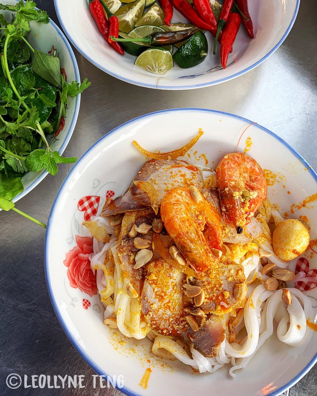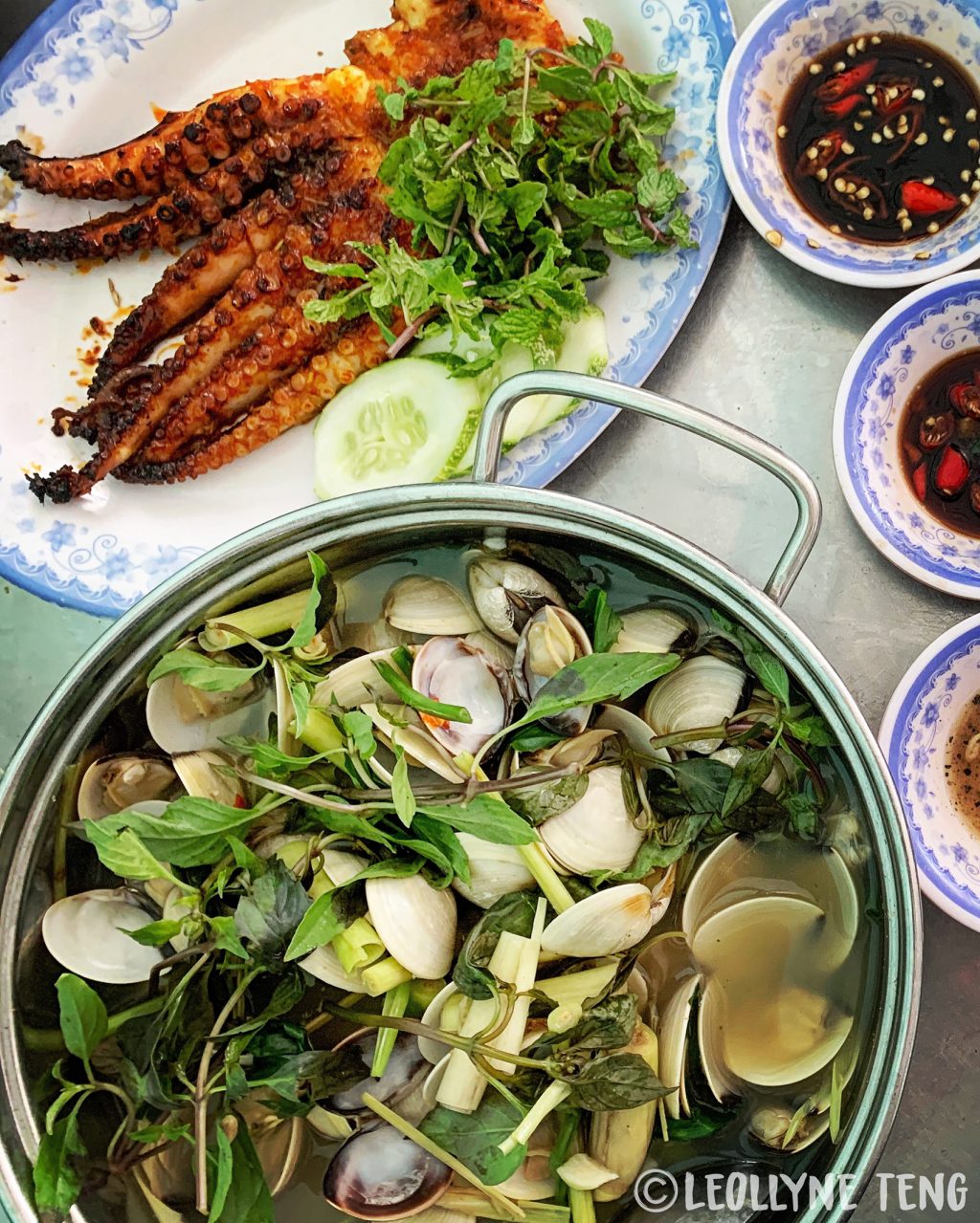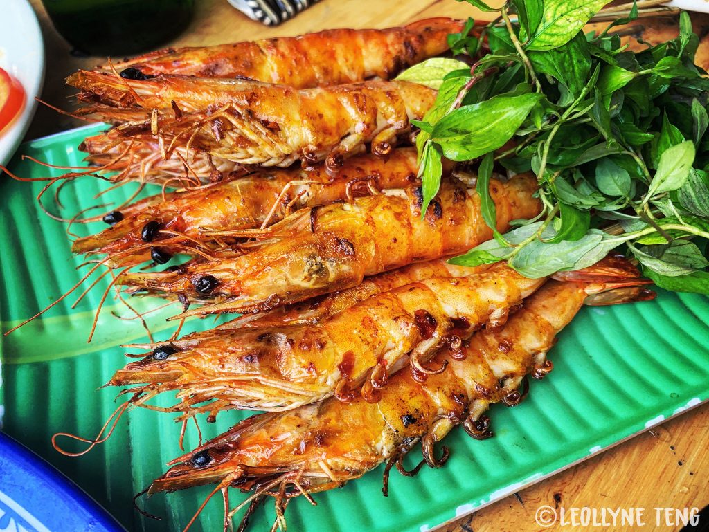 Bún riêu, a Vietnamese rice noodle soup, comes flavored with tomatoes, shrimp paste, fish sauce, and a meat broth. It features tofu usually, but the unique addition to this soup is the “riêu” or meatballs, made of pork, shrimp, crab, and prawns.Mì Quảng. This Vietnamese classic consists of a combination of flat rice noodles and yellow egg noodles served with a small amount of flavorful meat broth and crispy fresh vegetables and herbs. These include: banana blossoms, lettuce, cilantro, scallions, and Vietnamese coriander. This versatile dish can come topped with pork belly, chicken, shrimps, fish, boiled eggs, roasted peanuts, and fish crackers. Though it originated in Central Vietnam, more precisely the Quảng Nam Province, nowadays locals and visitors can enjoy mì quảng throughout the country.A must try at local Hai San (seafood) shops throughout Vietnam, grilled shrimps satisfy most appetites!The southern island of Phu Quoc hosts a range of seafood treats, like these Grilled sea urchins.Seafood pot of lemongrass clams and grilled octopus in Da Nang